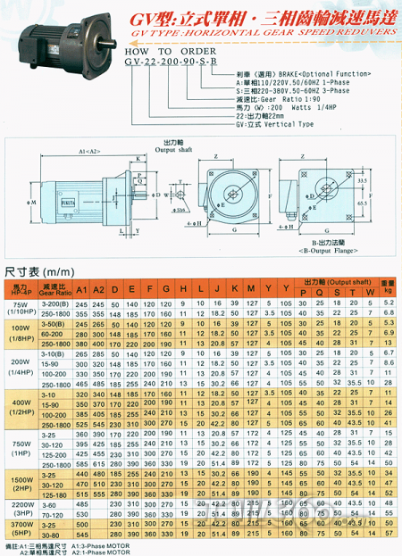 萬鑫GH,GV系列減速機型號:GH18(輸出軸直徑)-100(電機功率)-20(減速比)S(S代表三相,A代表單相) |